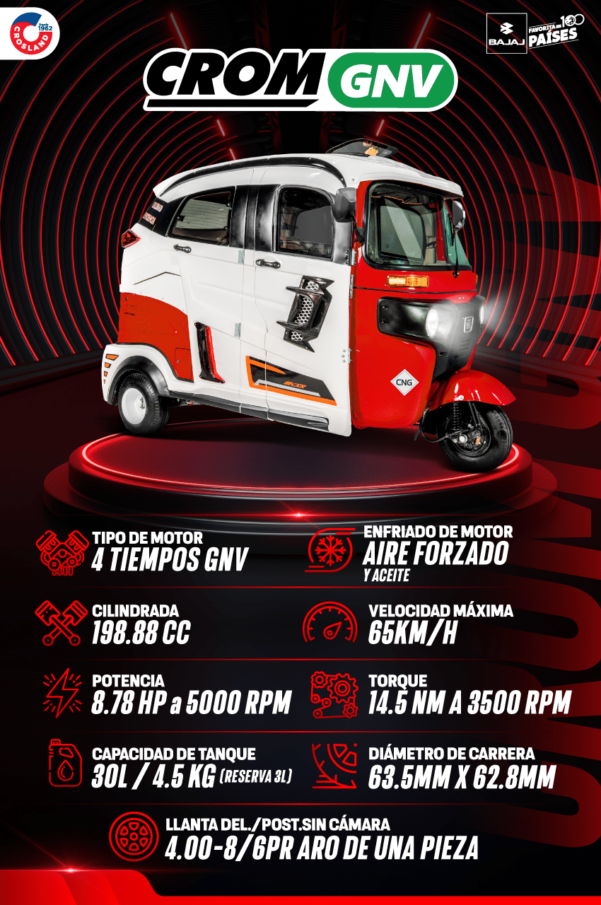 Si buscas una mototaxi que maximice tus ganancias, ¡CROM GNV es tu mejor opción! Cuenta con un tanque GNV de fábrica con capacidad de 30 litros, un tablero plus completamente renovado y llantas sin cámara.